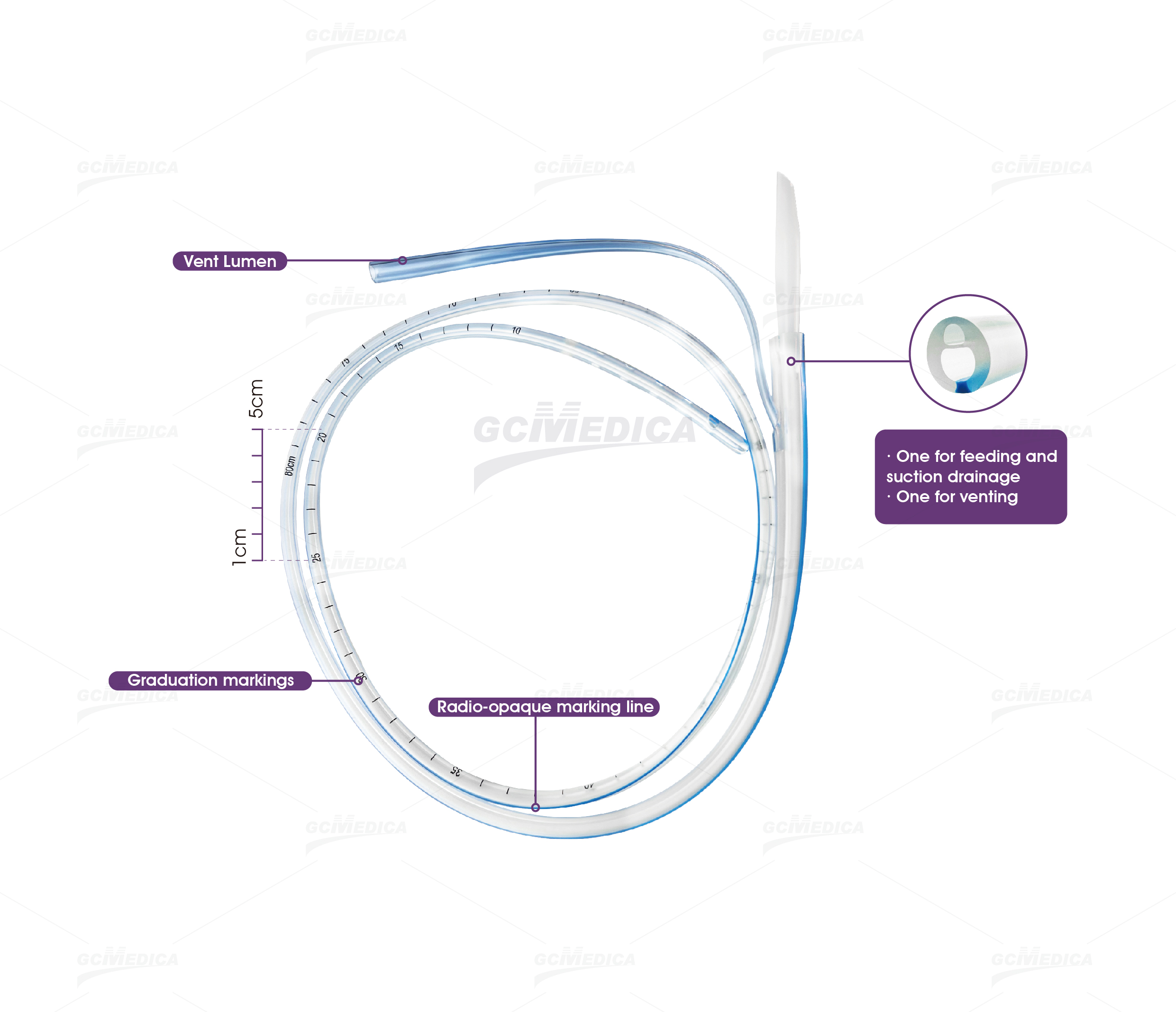 · Sonde à double lumière : la plus large permet une aspiration aisée du contenu gastrique, une décompression, une irrigation et l'administration de médicaments ; la plus étroite est destinée à la mise à l'air.